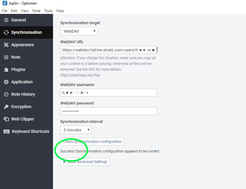 I am stuck with the IOS configuration and the strato hidrive WebDAV access. The WebDAV sync with the Win10 portable app (see below) works just fine. I then copied (literally via copy and paste and sync via notes to the ios device) and cannot get the sync on ios started.